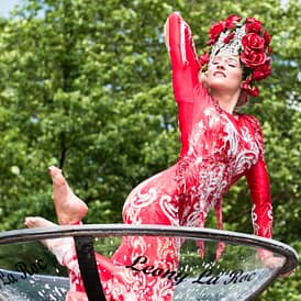 Sobald Leony den Raum betritt, zaubert sie ein Lächeln in die Gesichter. Auf Stadtfesten beginnen die Leute zu klatschen, wenn Leony an ihnen vorbei läuft. Nach Dita von Teese hat Leonylaroc mit die außergewöhnlichsten und hochwertigsten Kostüme der Welt. Wenn sie Burlesque der besonderen Art erleben wollen, sind sie mit Leony genau richtig. Viele ihrer Kostüme haben weit über 10.000 manchmal 25000 Svarowski Steine. Sie steht vor allem für Pompösität. Schrecken sie nicht zurück auch für einen kleinen Geburtstag anzufragen. Leony mag die Abwechslung. Sie tritt genauso auf einer Hochzeitsfeier auf, wie auch auf der Bühne einer Arena oder einer Erotikparty.