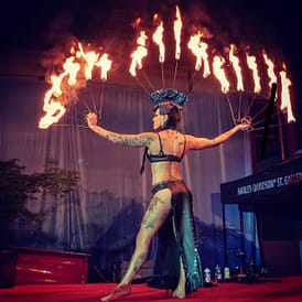 Elementen wie Feuer, Akrobatik/ Artistik und nach Bedarf auch einer Schlange setzt Sie ihre faszinierenden Kostüme,